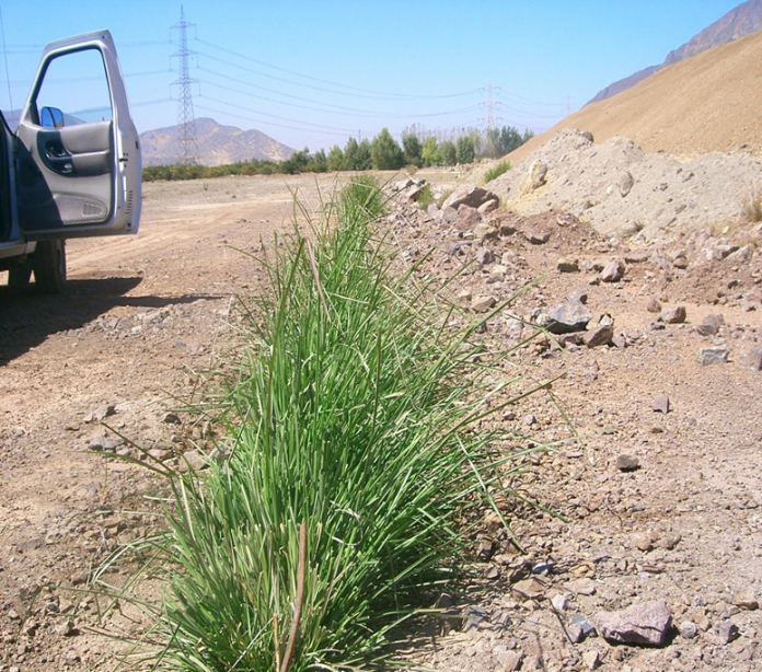 Estabilización de Canal de Regadio, V Región de Quillota junto al cultivo de Paltos. Vetiver logra una barrera densa al cabo de 6 meses de establecimiento impidiendo el desmoronamiento de los bordes del canal y logrando su estabilización. Además las hojas de vetiver que tienen forma de empalizada, impiden que el canal se ensucie con sedimentos y basura. Las raíces de vetiver generan una alta tensión logrando amarrar el suelo y proteger la estructura. Proyecto realizado por Bioingenieria Vetiver Chile para Agrícola productora de Paltas.